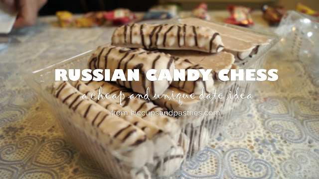 For our game, we just bought a bunch of different kinds of chocolates for a chess board game from the grocery store. Obviously not nearly as pretty as the chocolate chess set we saw in the store 😉 We set them up accordingly.