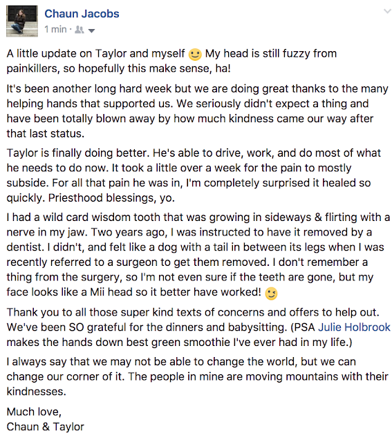 July 8, 2017November 14, 2021 CJ an update Taylor and I were knocked out from some crazy sicknesses for a couple weeks. Taylor doesn’t blog, and I’m still in recovery mode, so here’s what I shared on Facebook. The world is just full of great people. 🙂 Share this: Click to share on X (Opens in new window) X Click to share on Facebook (Opens in new window) Facebook Related