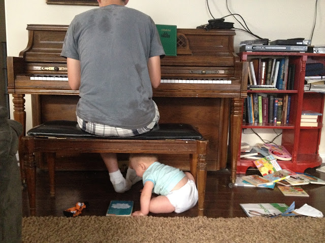 Archer has a favorite place under the piano bench, particularly when his dad is busy on it. But only after he destroyed the bottom shelf of the bookcase first.