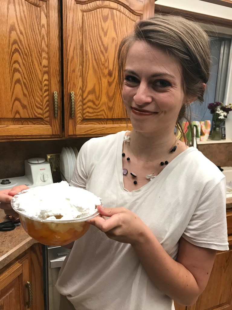 We ate pizza together. I offered my signature candy corn salad.