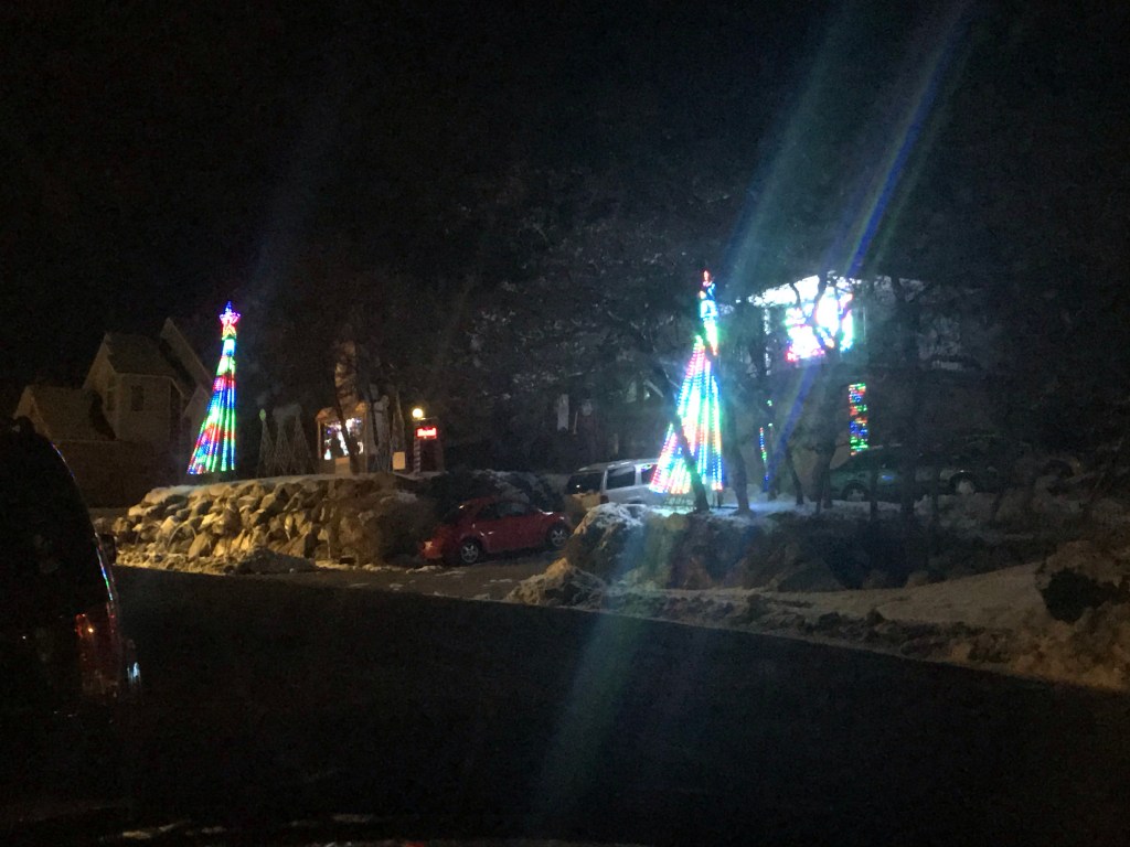 Enclosed in the contaminated air of our car, we played the radio and watched this awesome house put on a light show with their decorations. The children were delighted, except for Sander who could not care less.