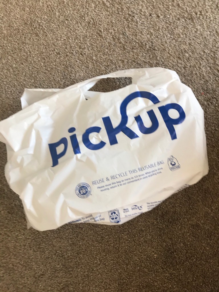 Look for anything that resembles a box in order to package it. When nothing can be found, make good use of the inconveniently thick plastic bags that Smiths uses for their grocery pickup.