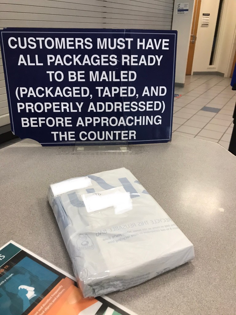 Take a hot morning bike ride to the post office. Arrive sweaty and stinky at the front of the line, just as other customers are piling into the building.
