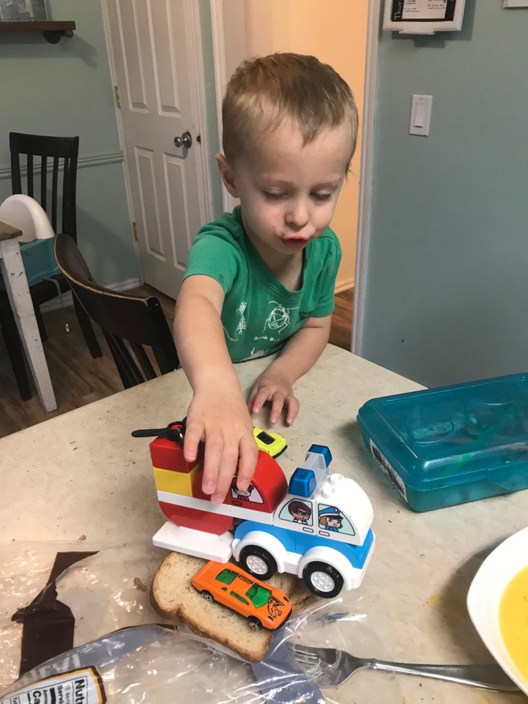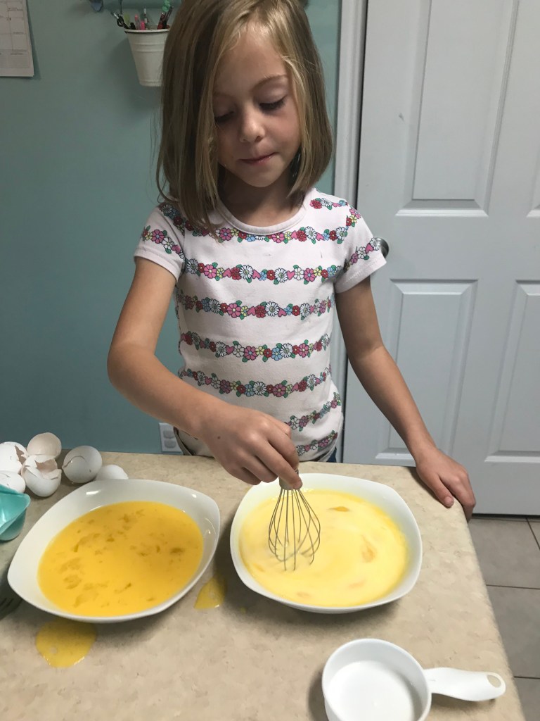 Arrow practiced making French Toast. Sander & his trucks did their very best to help.