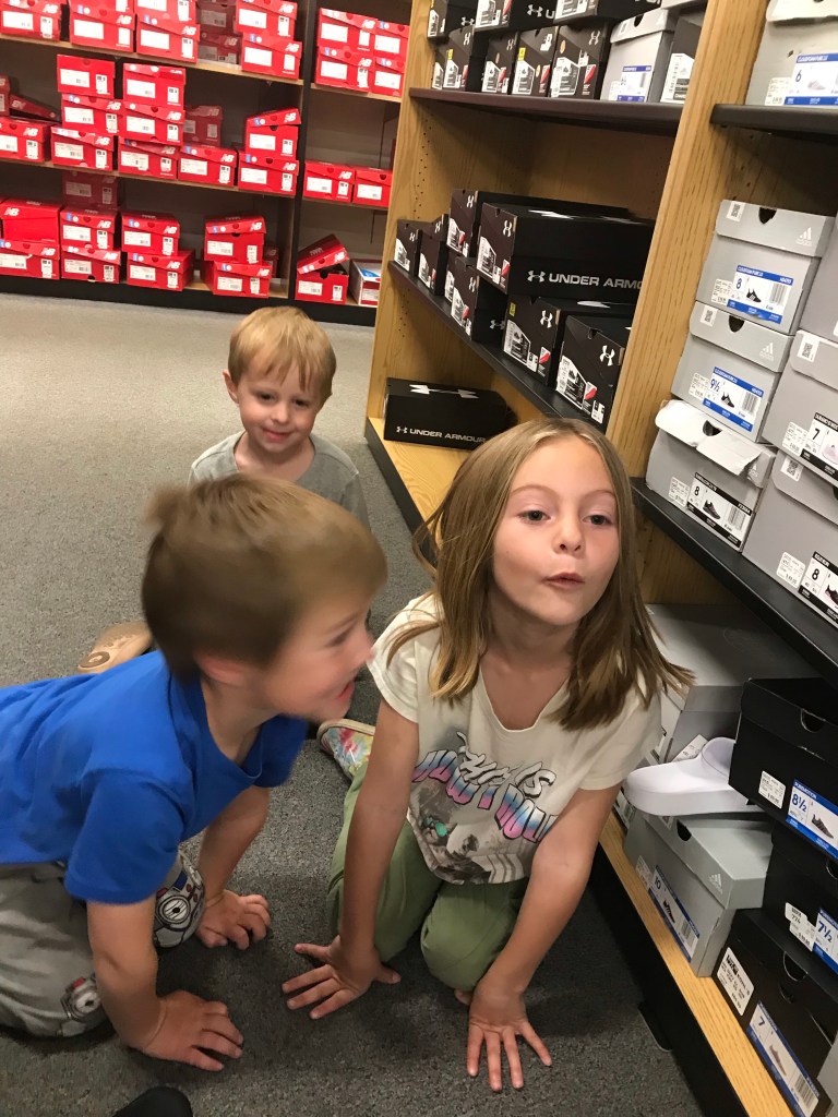 Brought the kiddos along while I shopped for a pair of good walking shoes. Here’s a picture of them nicely playing “runaway kitties” before giving into rampage urges.