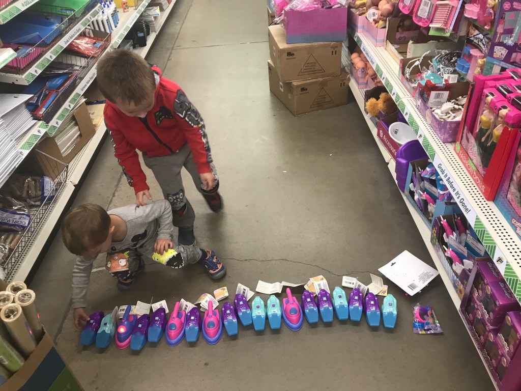 I allowed them a minute with their creation in the name of “childhood”, but promptly cleaned them up for the sake of all the patrons in Dollar Tree that day. Usually repetitive noises don’t bother me, but wow, those were an earful! The boys sure were pleased though. 🙂