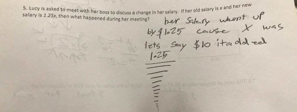 I promise you that’s not the case here. Because the students in question are 12 years old. There’s some kind of a brain shift at this age where their brains start “deleting” unimportant information. (This is legitimate by the way. I’ll ask Taylor for the psychological terms.) Incredibly, one of those pieces of information is critical thinking. They’ll develop this skill again over the next few years, but in the meantime it allows us some laughs at their attempt to solve math problems.