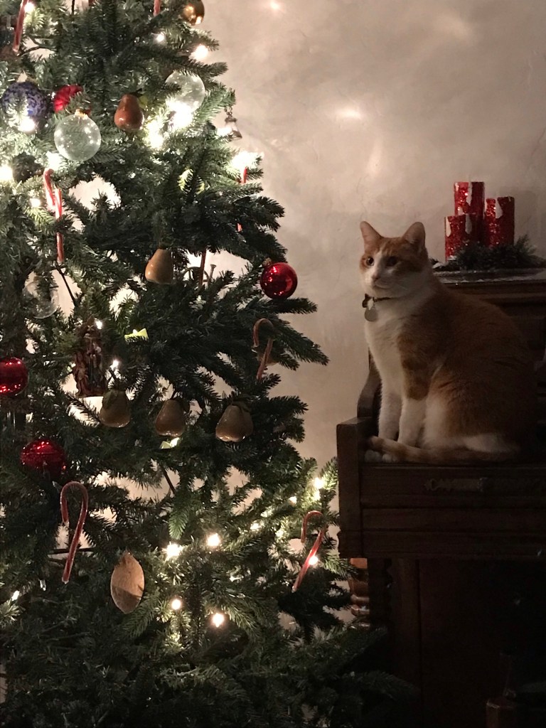 We put up a few decorations, including this candle display that our friend Kim made (behind the picturesque orange cat).