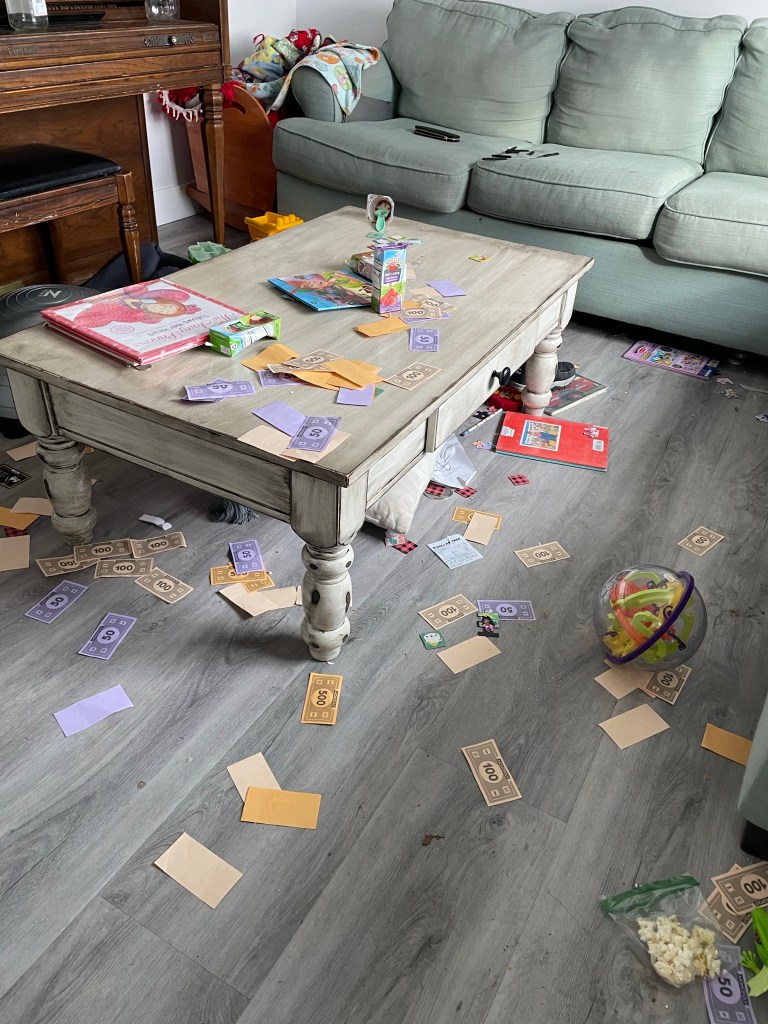 As the rose colored glasses began to dim, I realized that the coffee table looked a little odd. For one thing, it’s much too tall. Which is ideal for playing cards. Buuuut it’s difficult to play cards because of the square block on top.