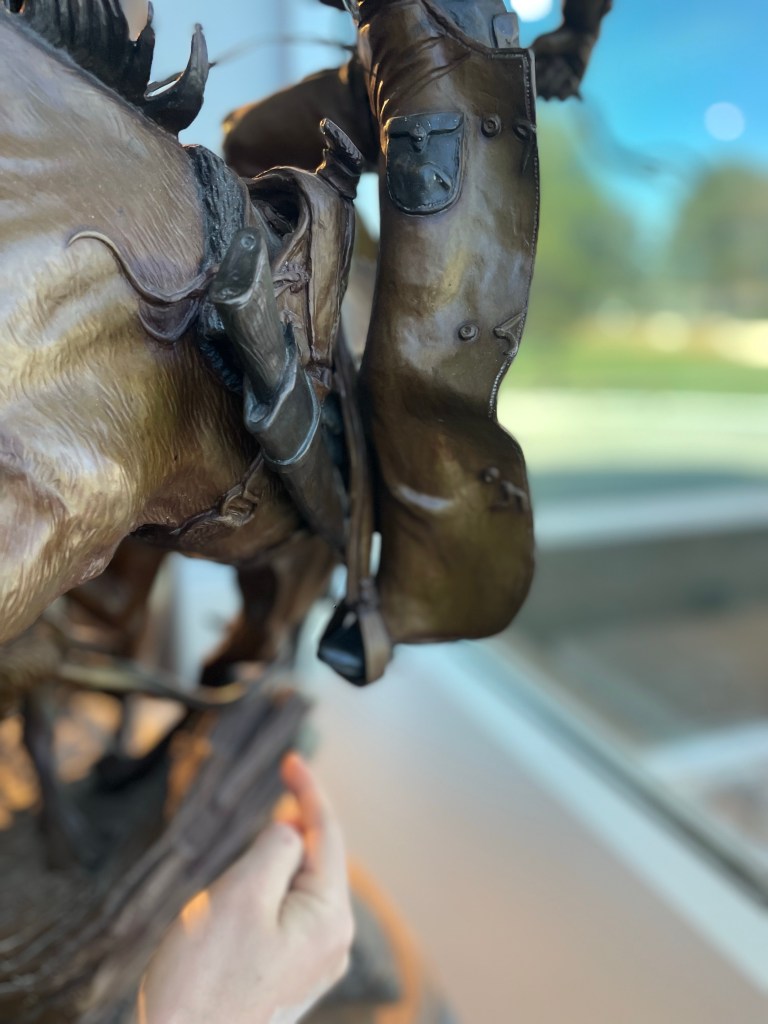 Look at this amazing bronze statue entitled “Over Easy”. The bronze of the cowboy and horse are joined only at the knee. I can’t even imagine how the artist supported the clay to do that.