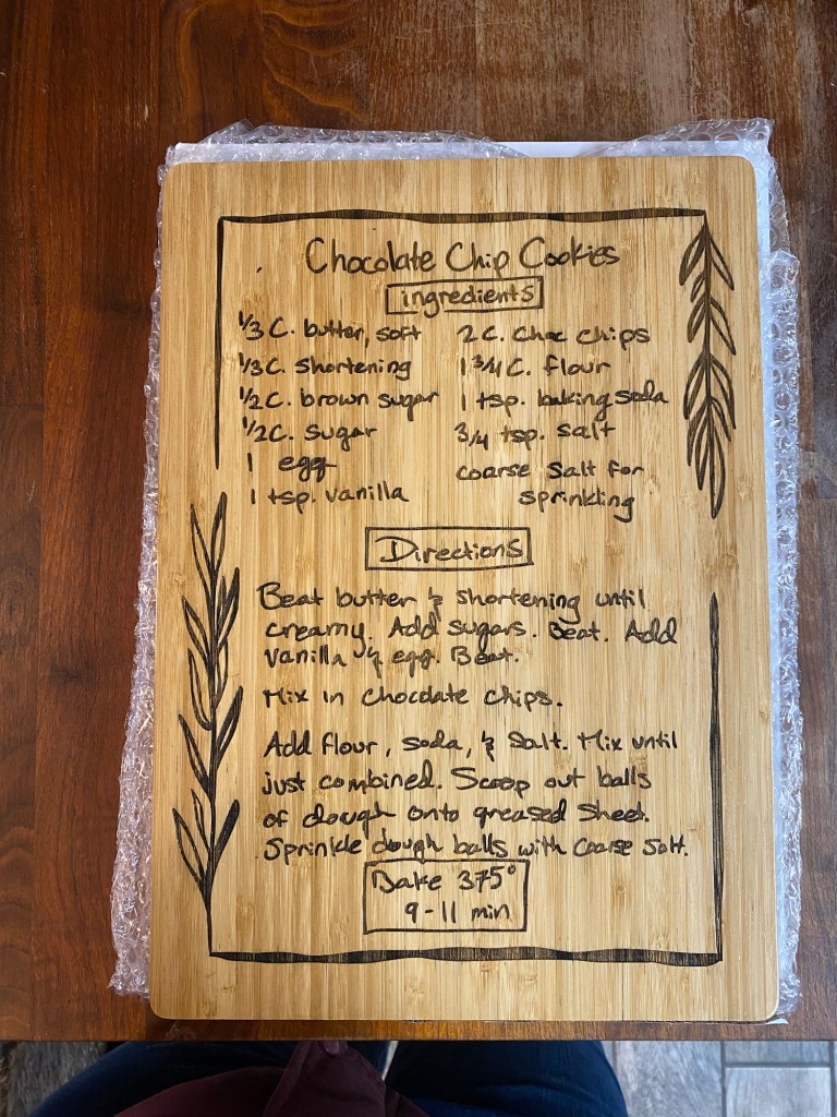Jackie & her husband run an engraving business. I hired them to make this cookie recipe cutting board. Isn’t it perfect?!