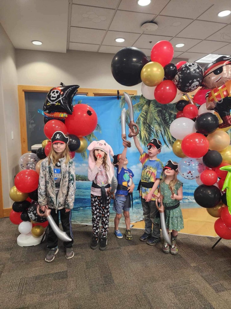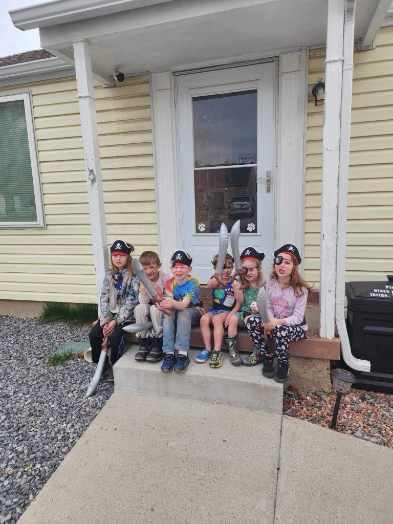 The kids went to a pirate party! My friend’s mom decked them out in the appropriate arghtire. (Thank you Janet!)