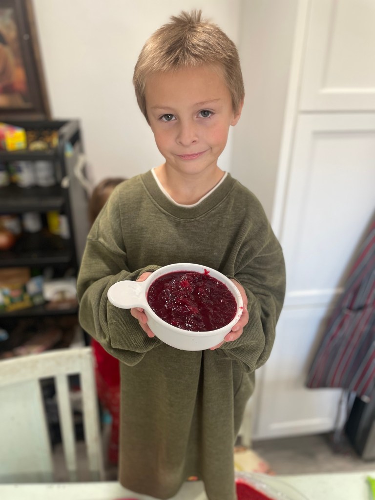 Archer on cranberry sauce. The children were delighted to watch the berries “pop” as they cooked.
